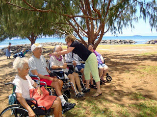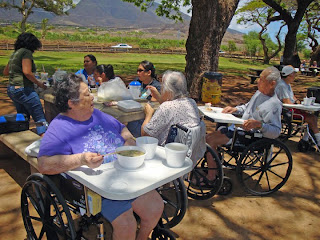Residents go holo holo for a picnic at Laniupoko Beach Park today and enjoyed the glorious weather and beautiful ocean. A couple of tourists were enjoying the beach and decided to give the residents their leis.