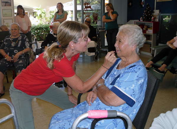 Roberta Yamada gets her make-up and hair done by a St. Anthony’s volunteer |