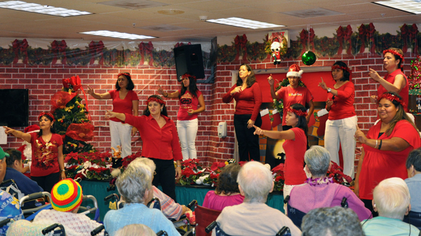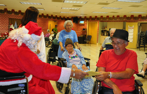 On December 23rd Hale Makua Kahului residents, families and staff enjoyed this year’s Christmas program. A last minute decision to move the program to the Aloha Cafe due to soggy grounds from heavy rains the night before didn’t dampen the Christmas spirit or festivities. The Aloha Cafe was beautifully decorated, staff performed several dances and songs, Lani was a gracious emcee, and Greg Juan played guitar and serenaded the crowd throughout the program.