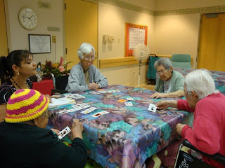 Top photo: Jodi Horton, Activities Assistant, looks on as residents compete in championship game of the Hale Makua Kahului Hanafuda Tournament