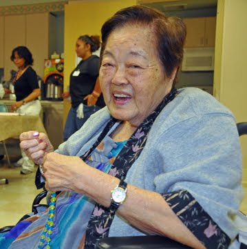 This afternoon, several of ladies lounged in the Aloha Cafe and strung together beaded necklaces that would be used for bingo prizes.