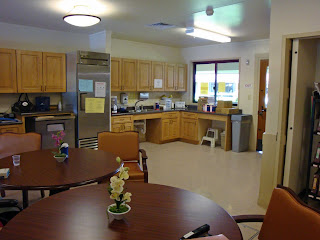 Back in January 2009 the renovation and transformation of the West Neighborhood nurses’ station into a kitchen, dining and living space for residents was completed. Nurses still do their paperwork here, but now it’s a mixed use area for both residents and nurses. Residents have a living area where they can watch TV and relax, and there’s a dining area adjacent to the kitchen where they can eat their meals with one another. One of the biggest challenges has been the adjustment of using the same space as a living area for residents and and a work area for nurses.